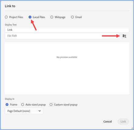 These are created in the same way as a link to another topic in the same project. Click the Insert Link icon and select Local Files, then click the Browse icon.