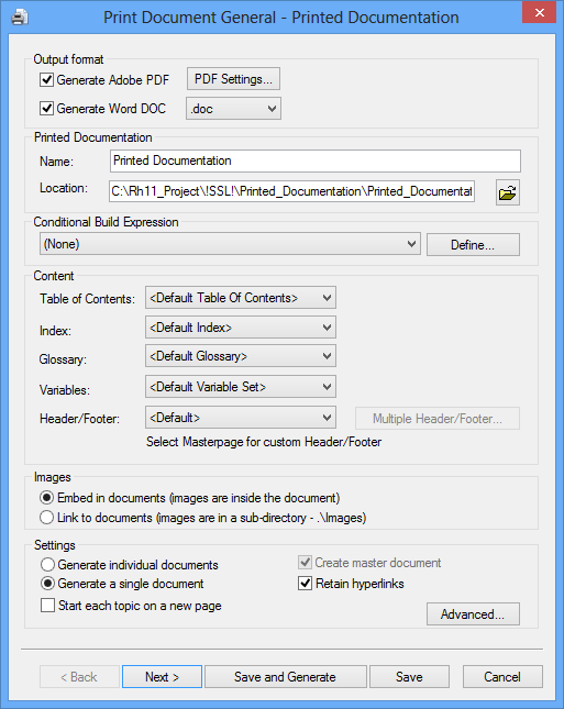 Unlike previous versions,RoboHelp 11 allows you to generate as many documents as you like to the same folder, provided of course they have different file names. A warning message will appear if you click Save and Generate and the folder already contains a document with the name specified.