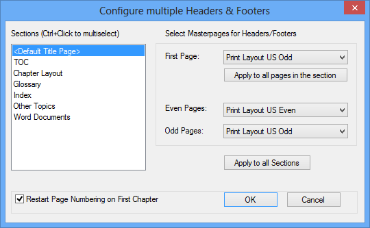 As you can see, you can select a First Page, Even Page and Odd Page header and footer. That can be applied to all sections of the document or you can have different settings for each section of the document.