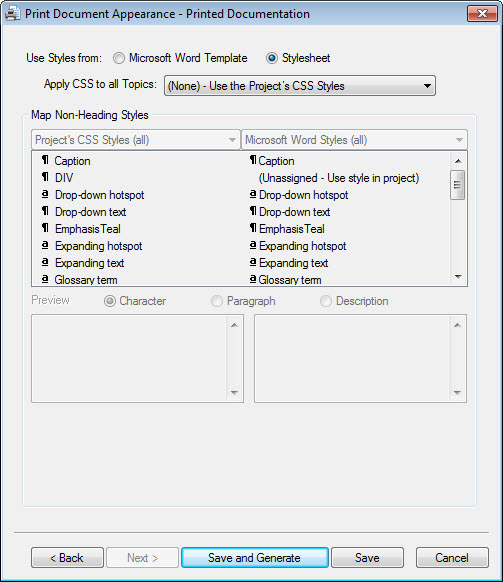 • If you select "None - Use the Project's CSS Styles" your printed output will print with the same fonts, font sizes, colours and so on as in the online help. Whether or not that looks good will depend on the CSS file(s) used.