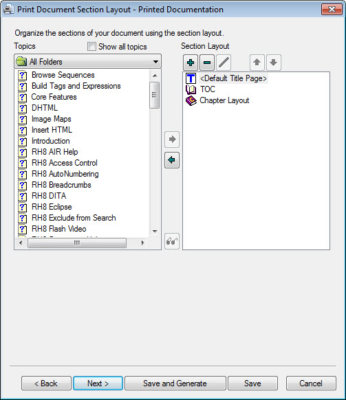 Tip: Use the TOC Editor rather than this page. I often create a copy of my online TOC and name it Print TOC. I edit that as it editing a TOC is easier than editing in this page of the wizard. When I get to this page of the wizard I just click the double left arrow to remove the existing layout and click the double right arrow to update the content to the current version of the Print TOC. Much easier.
