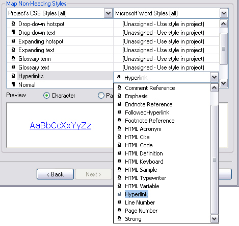 One thing to note is that when you click the dropdown on the right, it will not show all the styles in the Word template that you are using, RoboHelp will only display those that it regards as being appropriate to the style to which you are mapping.