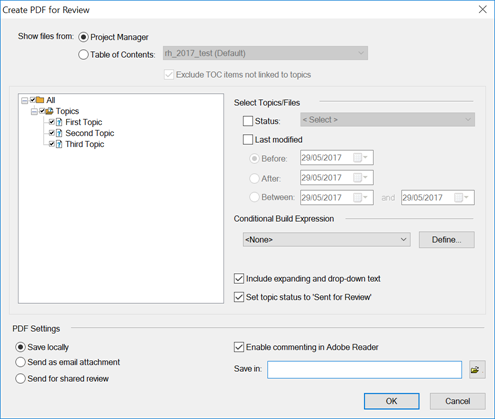 PDF Review creates a PDF file that you share in one of a number of ways so that the reviewer can add their comments. Note that it does not allow them to edit the content, simply to add comments to guide the RoboHelp author. The process works best if the author has Acrobat X Pro or above installed but it can still work if the reviewer has Acrobat X Pro or above.