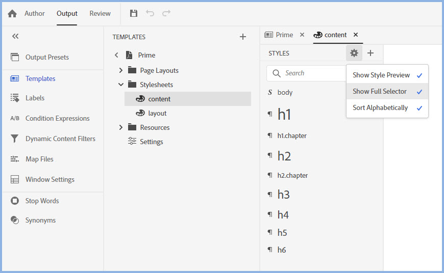 Glossary Terms in FramelessGlossary Terms in Frameless When you generate a framless output you can choose between the terms being shown as a popup, expanding text or a tooltip. By default popups use a rather large font compared with what most users would set as their normal paragraph style. This cannot be changed in the template but there are two solutions. Both require the following in a CSS file. You need to add this as a minimum. You can also define a different colour, different font and so on. .rh-popover { font-size:8pt; } You can either add that to