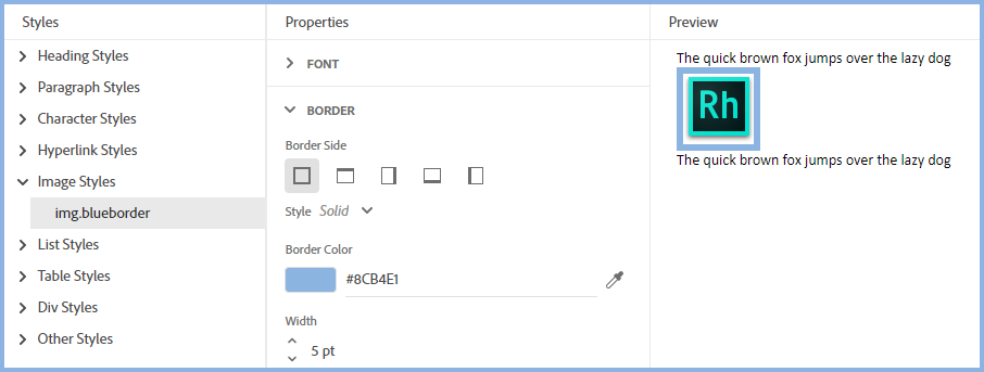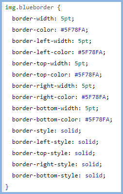 Image borders not showing in thumbnails?Image borders not showing in thumbnails? If an image style is applied to an image to put a border around it, that border will not show in the thumbnails or the expanded image in the output. The easiest solution is to simply apply a border to the image in an image editor such as Snagit. The border will then show in your topic, the thumbnail and the expanded thumbnail. The correct method is more complex but has the advantage that you can easily change the colour later or set different colours for different outputs. This is what you need to do. Create an image style in RoboHelpThis allows you to see the border when creating content. It also lets RoboHelp write the CSS code so that you can paste it into the other definitions you will require. This is a simple blue border created in the CSS editor.