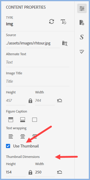 If you now generate an output without selecting the Use Thumbail checkbox, the image will have a blue border as defined above. ThumbnailsIf you want to use thumbnails, you need to click the image in the topic and select the Use Thumbnail checkbox, then set the size of the thumbnail image as shown below. In this example the thumbnail size has been set to roughly one third of the full image.