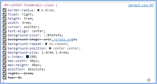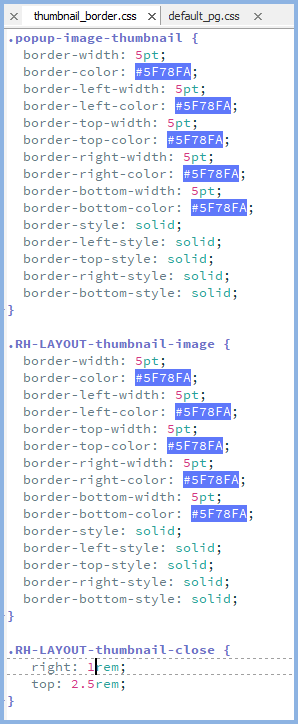 Without any further work, you will both the thumbnail and the expanded image but they will not have any borders. The SolutionYou need to create an additional CSS file that will be added to User Assets in your skin. Depending on your requirements two or three definitions need to be included in this CSS. For the purposes of this example, that CSS will be called thumbnail_border.css. Open a text or CSS editor and create the required definitions, which are: .popup-image-thumbnail .RH-LAYOUT-thumbnail-image .RH-LAYOUT-thumbnail-close (Optional) In the first two you can simply paste in the source code from the img.blueborder style you created in your main CSS or you can define it as required. The .RH-LAYOUT-thumbnail-close definition is only required to reposition the white close icon or define a different button. Save the file in a temporary folder as thumbnail_border.css. The CSS will look something like this.
