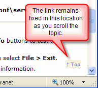 This is the code to be used within each topic and within your (MyProject).css file: At the top of each topic (I have it just under the H1 heading) <p class="top"><a class="topic" title="Return to Top" href="#">↑ Top</a></p> In your .css style sheet file (place the p.top after the default p & LI.p settings, and the A.topic's after the default A settings) p.top { PG: I did not include the link definitions in my CSS and it worked fine. That may have been because I already had appropriate definitions. See what works for you. A.topic:link, Simply customize my settings to suit your organization's style and formatting needs (fonts, location, padding, border, etc.). |