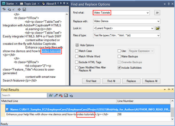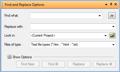 The Find and Replace in Files function has been completely changed and now appears in a pod. You can globally find and replace text, HTML tags, and attributes in the current project or across files and folders. RoboHelp displays the results in the Find Results pod and also lets you open each modified file in the Find Results Editor pod (HTML view).