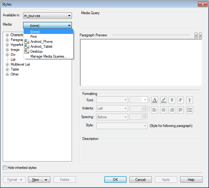 The Media dropdown allows you to specify that a variation of the style is to apply for specific media. The options shown there are the Screen Profiles that you have created plus one other, Print.