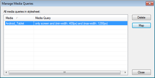 At its simplest, that is how you define different rules for each media. But what if you want to then apply the same rule to a number of other media? To save you then having to repeat the changes for each media, there is a Manage Media Queries option. So to set the same rule for say Android Phone, you would not duplicate the changes, instead you would next select the Manage Media Queries option. That shows the queries you have created for the Android Tablet and you simply click Map to apply the same rule to another media. A dropdown list will be displayed showing each screen profile you have created in the project and you would simply select Android Phone.