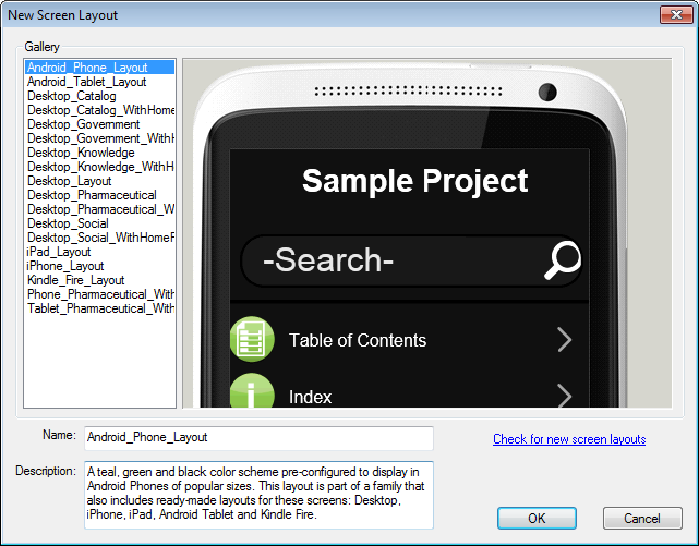 In Project Manager you set up the screen layouts (stored in .SLZ files) that you will want to use for any multiscreen single source layout that you have in the project. Your project may have many multiscreen layouts in the same way as it can have many webhelp single source layouts.