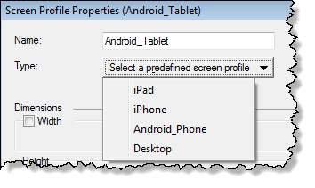 - You could have one profile for both Android the smartphone and the tablet by setting the parameters to something that would work for both. The content would be the same and the device would handle to sizing and in the real world that can be the most pragmatic solution. However, for the sake of this exercise, we will have a separate profile so that we can link it to a different screen layout.