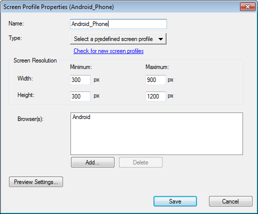 The screen profile is where you can set up the screen sizes you want to define and/or the browser agents that may be used. For this scenario: