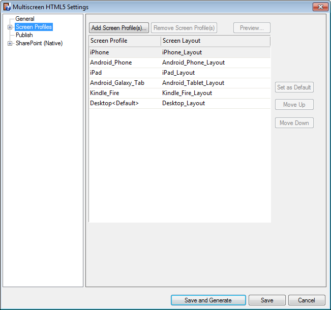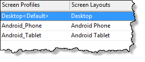 We do not want iPhone and iPad in this example so we will delete those by highlighting them and clicking the Remove Screen Profile(s) button. That only removes the profile from the layout, not the project. We can then set a default and the order in which the profiles appear. We also need to map the profiles to the screen layouts so that we end up with the required profiles mapped to their screen layouts.