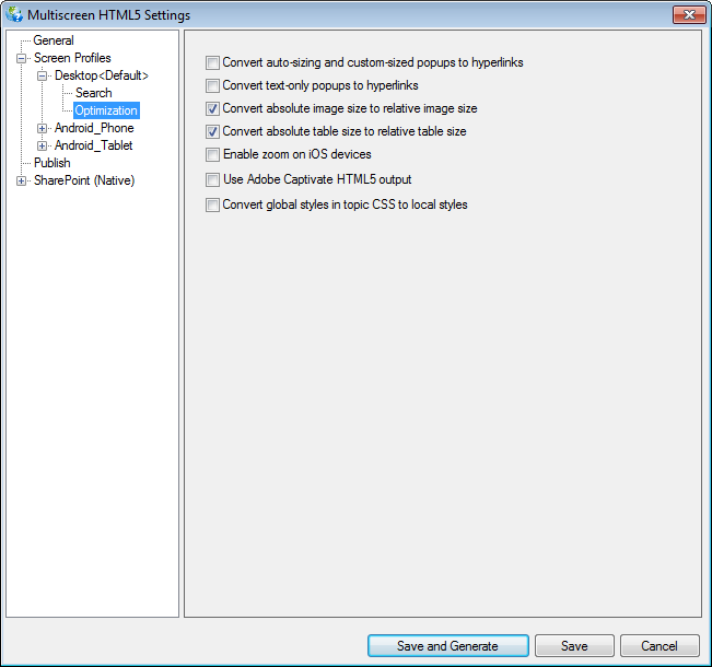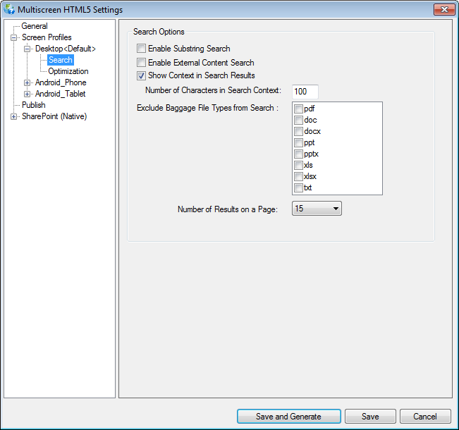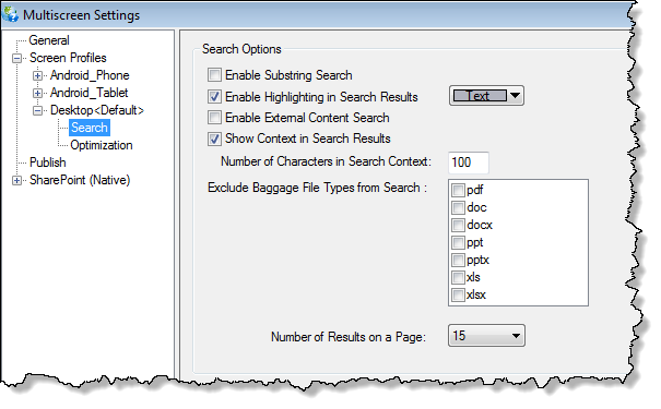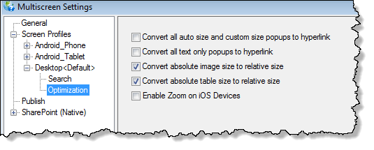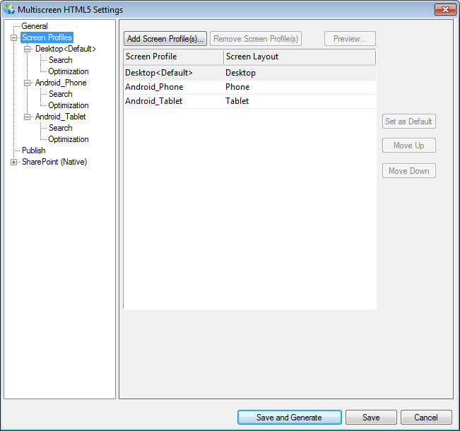 The General, Publish and Sharepoint settings are outside the scope of this topic so here we will focus on just the settings for Screen Profiles.