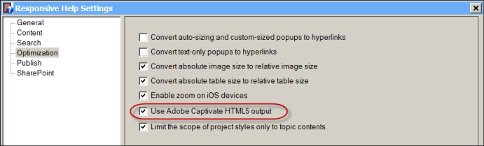 If your projects include Captivate 7 HTML5 videos, there is an optimization setting when you generate a Multiscreen or Responsive HTML5 output from RoboHelp.
