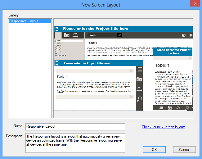 In Project Setup, you will see a Screen Layouts option. Right click that to open this dialog. Note the Check for new screen layouts link as more will be added in the released version of RoboHelp 11.