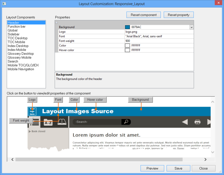 Having picked your preferred layout, expand it to see its parts. As with Multiscreen HTML5, you can right click any of the resources it uses but there is now a much easier way to edit selected items. Right click the layout name itself and click Edit to open the simplified layout editor. It provides the options that most authors will want.