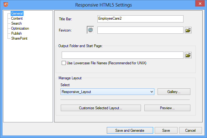 The General settings allow you to select the screen layout to be used in this Responsive Single Source Layout.