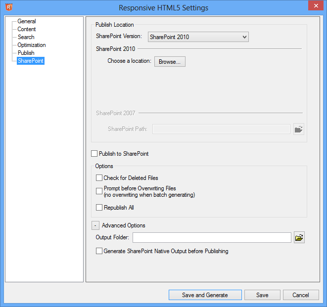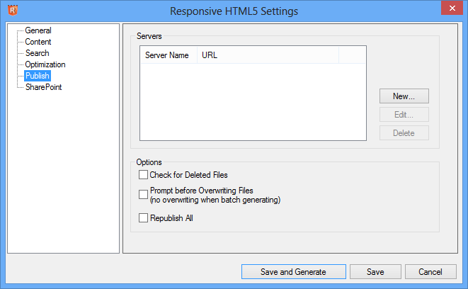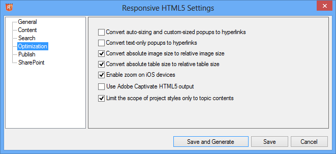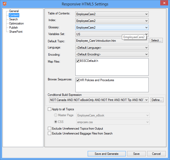The Content settings are the same as with WebHelp. With Responsive HTML5, the content will be the same on all devices. Use Multiscreen HTML5 if you need to have different content on different devices.