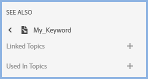 First click the + icon for Linked Topics to link the topics you want associated with the keyword, the list of topics that will appear in See Also for users.