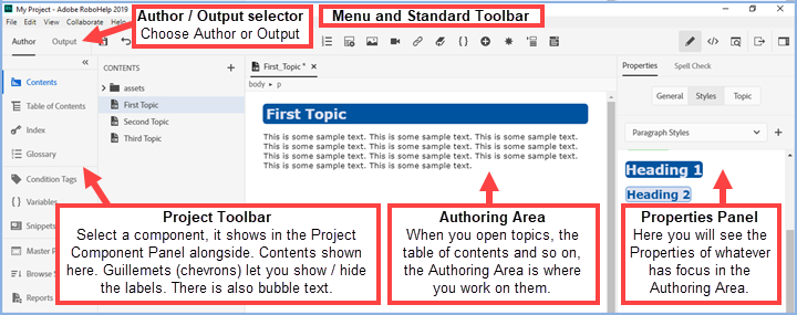 The Project toolbar controls what is displayed in the Project Component Panel alongside. For simplicity, what you see here when you click an icon in the Project toolbar is described in separate topics. See the links below or the Table of Contents.