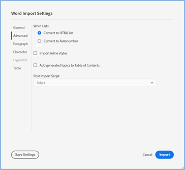 Add Topics to Table of Contents If you select Add Topics to Table of Contents, you will be able to create a new TOC or add to an existing TOC. A page will be created in the TOC for each topic created on import. By default all the topics will be at the same level. However, there is a check box you can select so that the TOC follows the hierarchy of the styles and you can set which styles are to be used for the TOC hierarchy. The Word Style(s) shown on the left will be whatever you have defined in General Settings to split the document. On the right you select the TOC heading level for that Word style. Post Import Script Supplied scripts or your own scripts can be set to run automatically after import. |