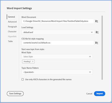 Word Document As soon as you have selected the document, in the bottom right corner of the window you will see Adobe RoboHelp reads the document after which you can proceed with the other settings. You can only import documents in DOCX format. If they are in DOC format, you need to upgrade them first. Load Settings The default WSF (Word Settings File) set in Project Settings will be displayed. Use the search icon to change to another WSF file if required. CSS File For Style Mapping Select the CSS file to be used for mapping.
