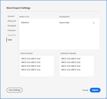 Adobe RoboHelp attempts to automap styles where it can match the name in the Word document with a style in the CSS defined for style mapping. Against each style in Character, Paragraph and Table settings you will see how the styles have been mapped.