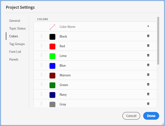 New colours can be added to the swatch from Project Settings.