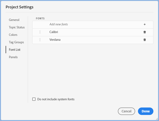 Generally when authoring a topic the fonts will be defined in the CSS used for the topic. Sometimes though you need to apply an inline font. You can limit the list of fonts that appears in Properties > General > Font or you can prioritise certain fonts to appear first.