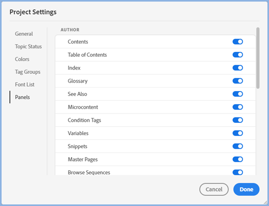 There are various panels in Adobe RoboHelp showing all the options but you may not need all of them. For example: