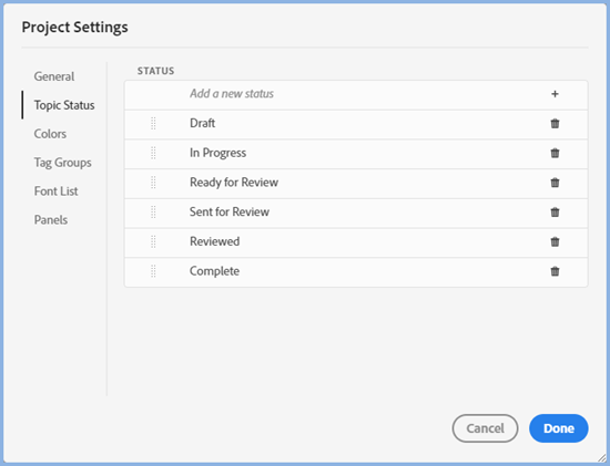 A number of statuses are preset. To add a new one, enter the name at the top and click the + icon.