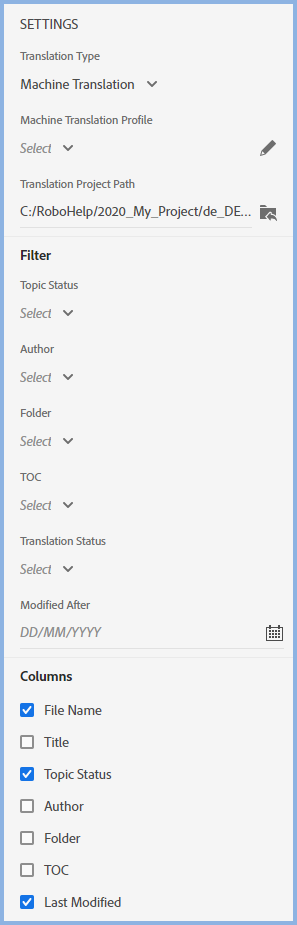 After translation, the agency will return an XLIFF file that will be imported into Adobe RoboHelp to generate the project into the required language. Machine translation is also an option although it is best checked by a native speaker.