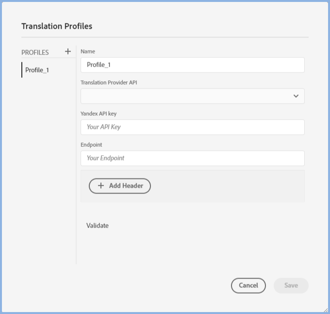 Enter a name for the profile and choose one of the APIs in the dropdown list. There are a number of sites where you can register to use their services in line with their terms and conditions. Yandex Translate is supported but Yandex Cloud Translate (an EU only service) is not supported.