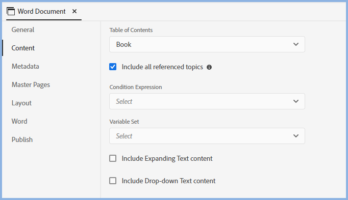 Most of the options here are obvious but be aware of a change from Classic versions. Previously in all versions of RoboHelp, the content has been limited by design to just those topics in the print layout TOC rather than all topics in the project not excluded by a condition expression as in online outputs. Now all outputs are based on the TOC used so any change to the TOC will also affect the print output. You can create a separate TOC if required.