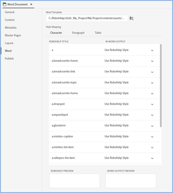 When you generate a Word document, Adobe RoboHelp will automatically try to map the topic styles but you can make changes as required in the Word section of the preset. What you see in the Word document will depend on how you set up the mapping and how the CSS rules impact your document.