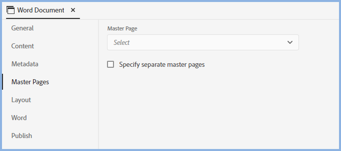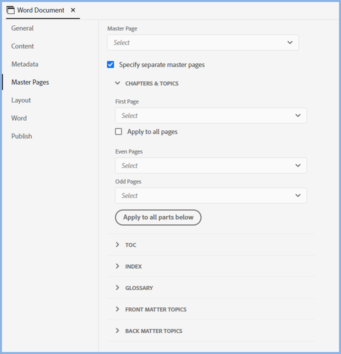 In a new preset, the Master Pages options will show as above. By default it will be assumed that if a master page is selected, it will apply to all sections of the document as defined in the TOC.