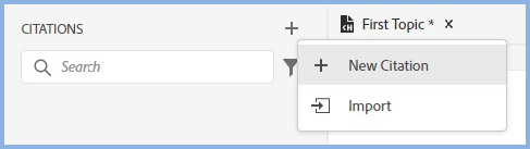 Click Citations in the left toolbar and click the + icon shown below, then click New Citation. Alternatively if you have a citations file in BibTex format, you can import that.