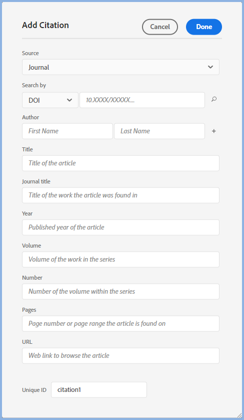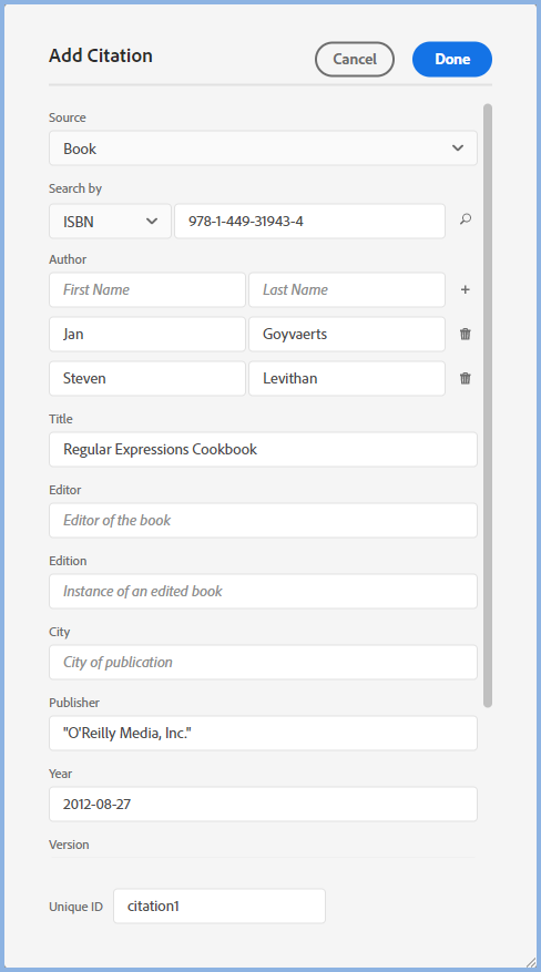 Whilst you can change the Unique ID before you save the new citation, it is recommended you leave the default and let Adobe RoboHelp take care of avoiding duplication.