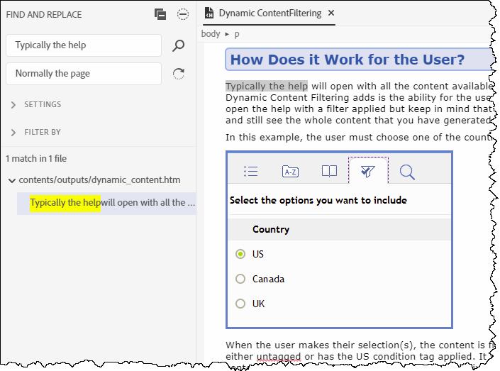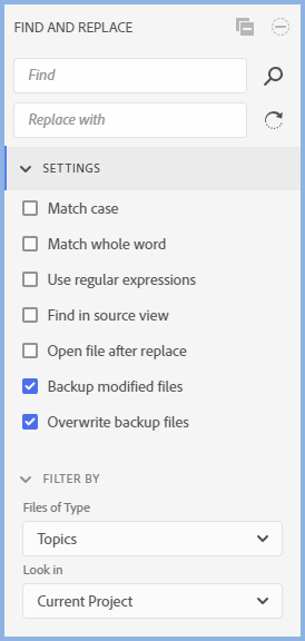 Whichever way you open the Find and Replace in All Files functionality, it will open what you see below alongside the left toolbar. Select another toolbar option to close it when you have finished. Here the panel is shown with the Settings and Filter By panels expanded to show all the options.