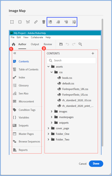 If any mapped areas need to overlap, use the four toolbar icons highlighted blue to set the priority.