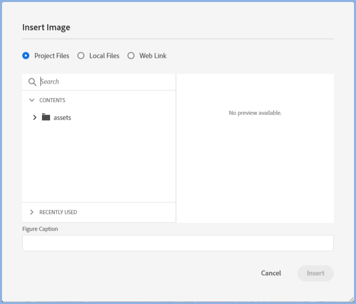 Click in your topic where the image is to appear, then click the image icon on the authoring toolbar, browse your Project Files or Local Files or paste a link to the image and click insert.