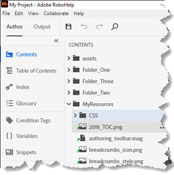 Simply right click in the Contents Panel and click Link > Link File or Link Folder and browse to what you want to see in Adobe RoboHelp. In this image a folder has been added.