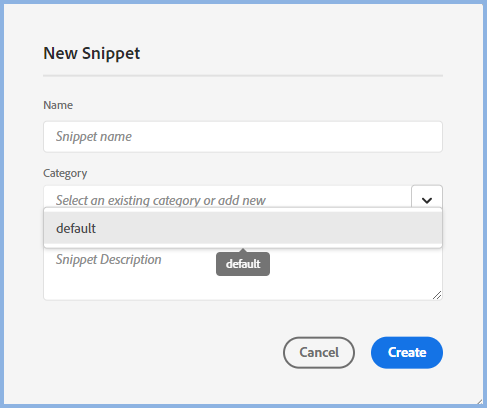 - To create a new snippet, click the + icon and select Snippet to access this screen.