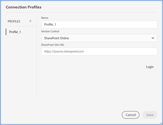 Click Collaborate on the menu to create or open a connection. The fields you see with vary according to the requirements of the Version Control system selected in the dropdown.