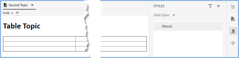 In the screenshot below a table has been added to a topic using the Insert Table icon in the standard toolbar but the CSS used for the topic does not have a table defined.