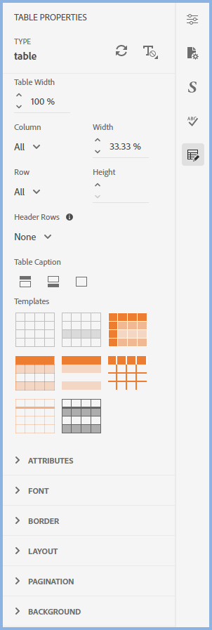 With the cursor in the table, the Properties panel will display an additional icon.