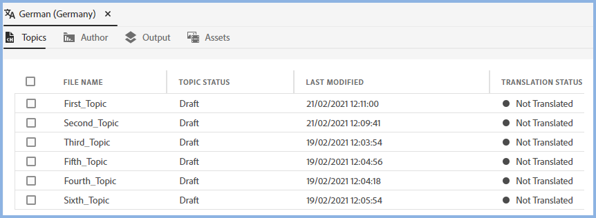 Initially the authoring areas will show everything that needs to be translated. This screenshot shows just a few topics and the fact that at this point, the German project has not been translated.